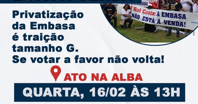 Ato convocado pelo Sindae será realizado às 13h desta quarta (16) em frente à assembleia legislativa baiana. O ato será transmitido ao vivo na página do Sindae do YouTube